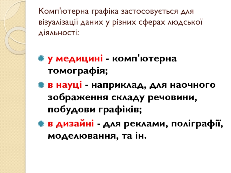 Слайд 4Комп'ютерна графіка застосовується для візуалізації даних у різних сферах людської