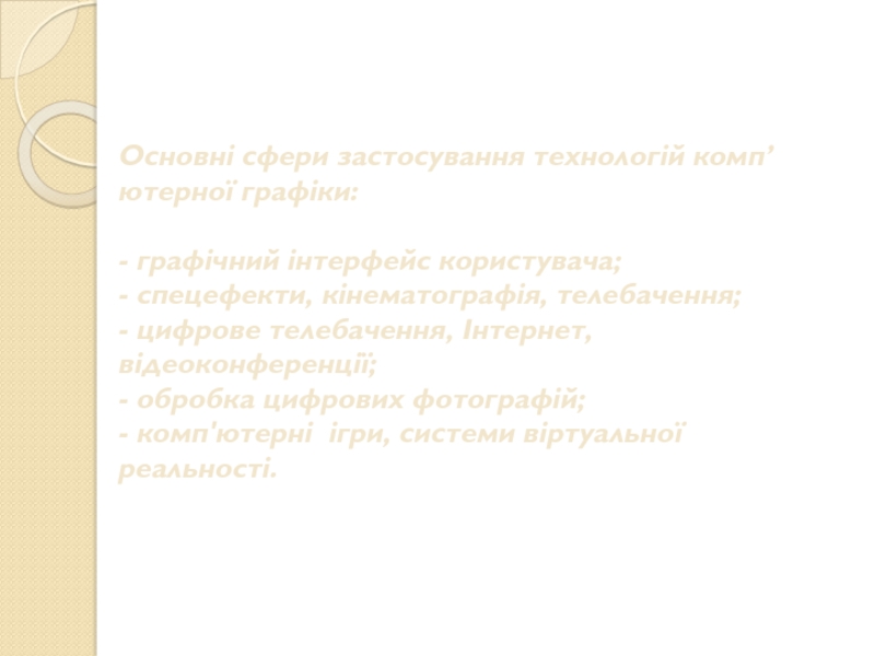 Слайд 3Основні сфери застосування технологій комп’ютерної графіки: