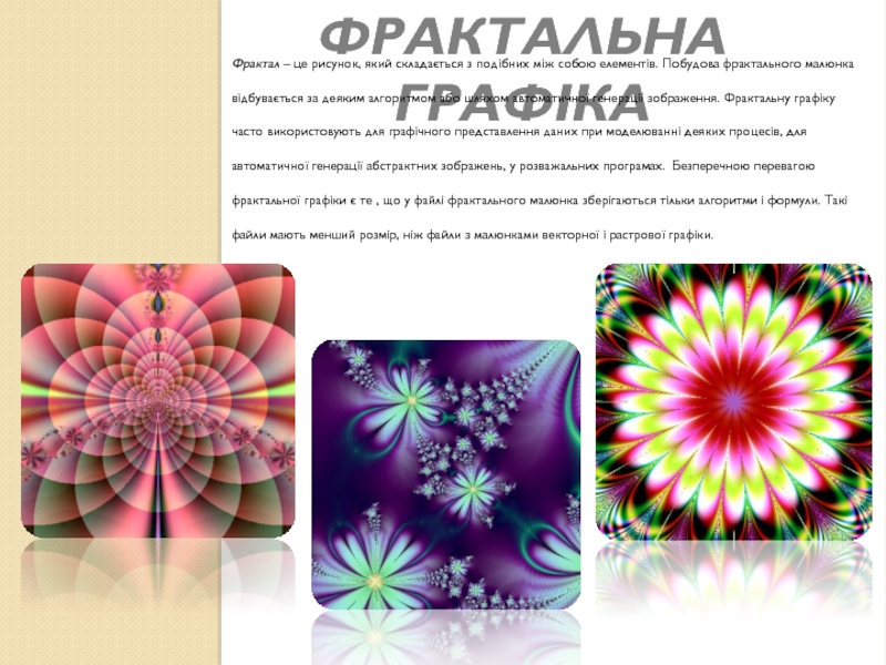 шляхом автоматичної генерації зображення. Фрактальну графіку часто використовують для графічного представлення даних при моделюванні деяких процесів, для автоматичної генерації абстрактних зображень, у розважальних програмах. Безперечною перевагою фрактальної графіки є те , що у файлі фрактального малюнка зберігаються тільки алгоритми і формули. Такі файли мають менший розмір, ніж файли з малюнками векторної і растрової графіки.
