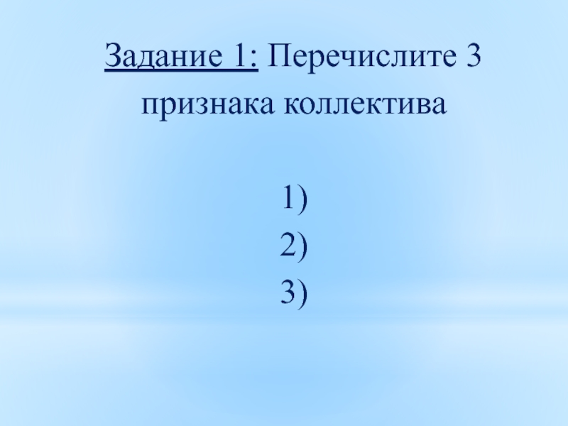 Слайд 5Задание 1: Перечислите 3 признака коллектива