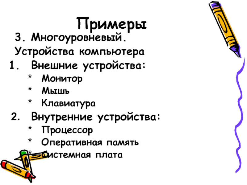 Примеры3. Многоуровневый.Устройства компьютераВнешние устройства:МониторМышьКлавиатураВнутренние устройства:ПроцессорОперативная памятьСистемная плата