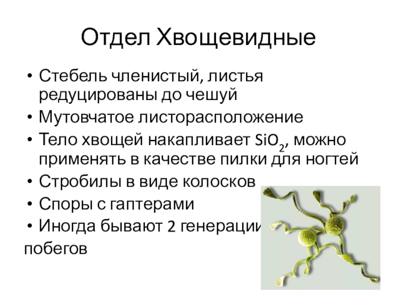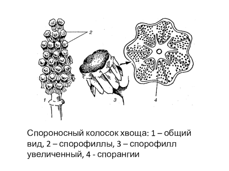 Слайд 45Спороносный колосок хвоща: 1 – общий вид, 2 – спорофиллы,