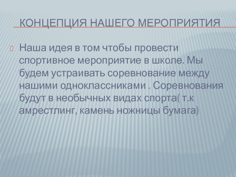 Концепция Нашего мероприятияНаша идея в том чтобы провести спортивное мероприятие в школе. Мы будем устраивать соревнование между