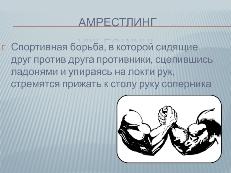 АмрестлингСпортивная борьба, в которой сидящие друг против друга противники, сцепившись ладонями и упираясь на локти рук, стремятся прижать к столу руку соперника