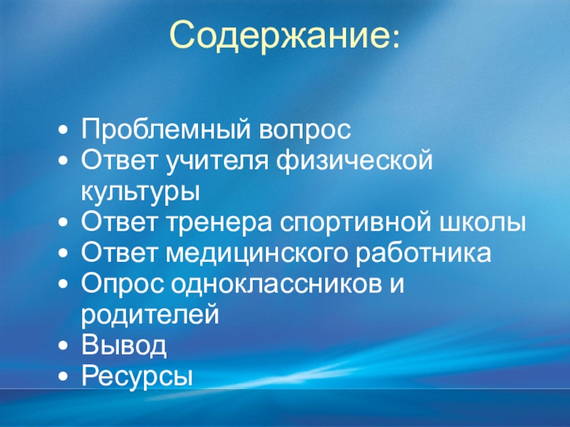 Содержание: Проблемный вопросОтвет учителя физической культурыОтвет тренера спортивной школыОтвет медицинского работникаОпрос одноклассников и родителейВыводРесурсы