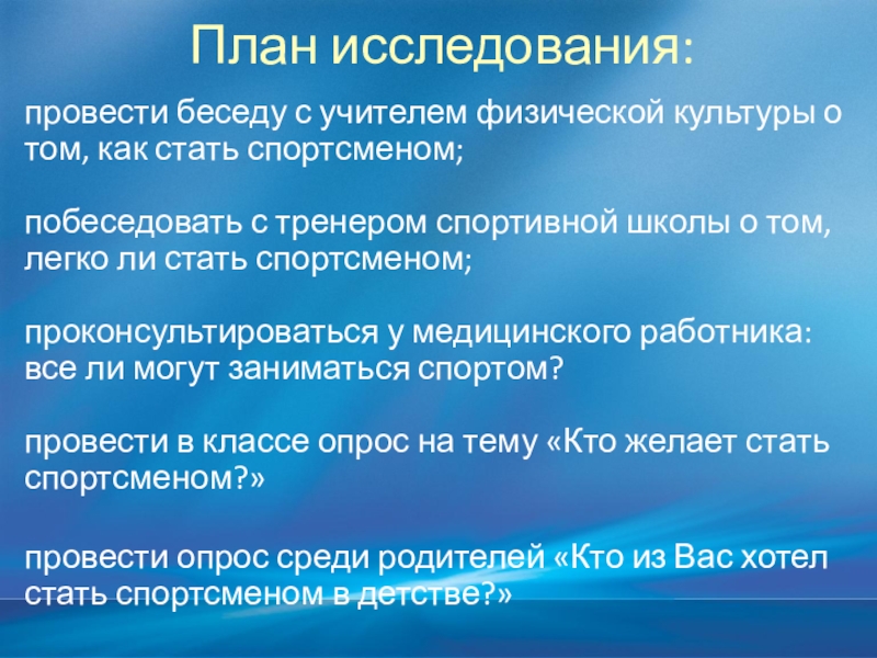 План исследования:провести беседу с учителем физической культуры о том, как стать спортсменом;побеседовать с тренером спортивной школы о