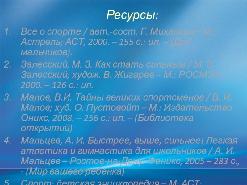 Ресурсы:Все о спорте / авт.-сост. Г. Михалкин – М.: Астрель; АСТ, 2000. – 155 с.: ил. –