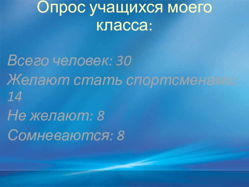 Опрос учащихся моего класса:Всего человек: 30Желают стать спортсменами: 14Не желают: 8Сомневаются: 8