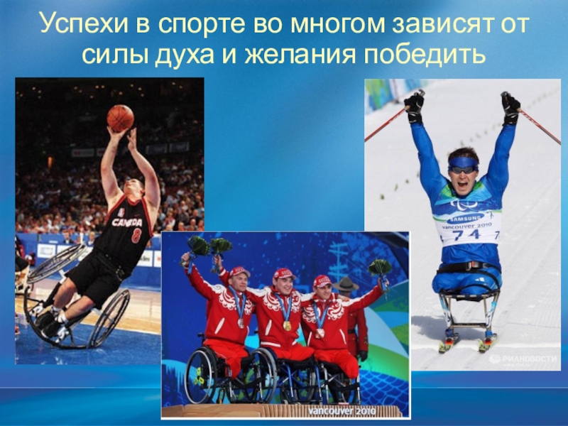 Слайд 11Успехи в спорте во многом зависят от силы духа и
