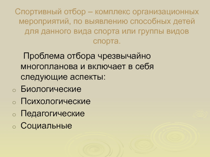 Слайд 39Спортивный отбор – комплекс организационных мероприятий, по выявлению способных детей
