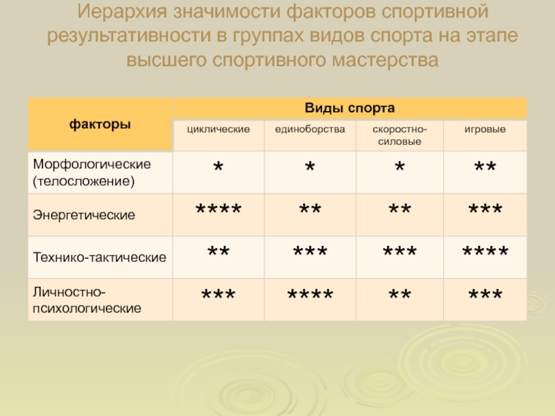 Слайд 49Иерархия значимости факторов спортивной результативности в группах видов спорта на