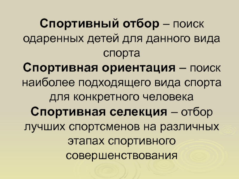 селекция – отбор лучших спортсменов на различных этапах спортивного совершенствования