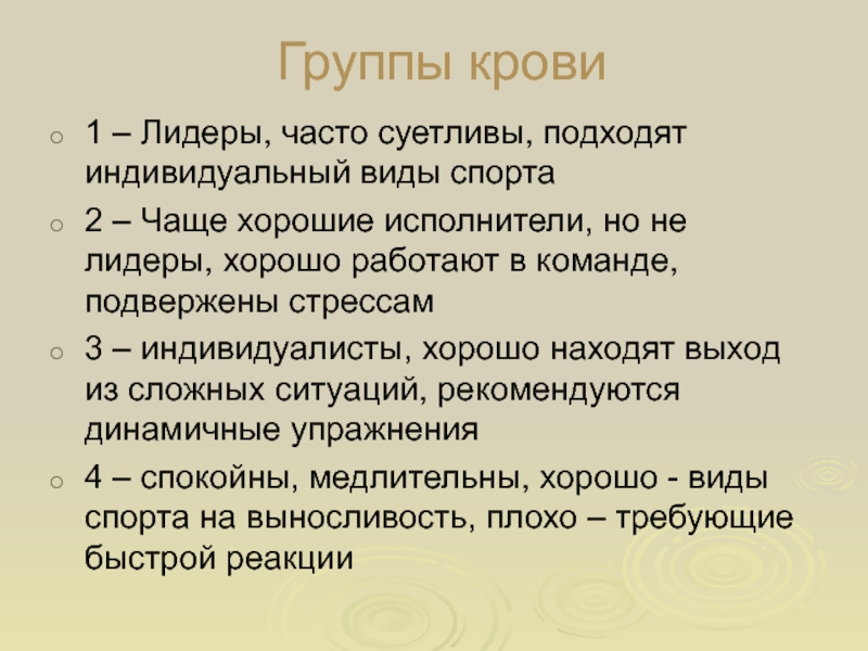 4 – спокойны, медлительны, хорошо - виды спорта на выносливость, плохо – требующие быстрой реакции