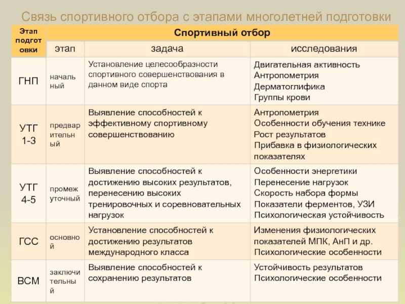 Слайд 51Связь спортивного отбора с этапами многолетней подготовки