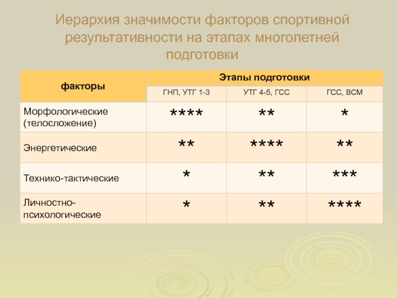 Слайд 50Иерархия значимости факторов спортивной результативности на этапах многолетней подготовки