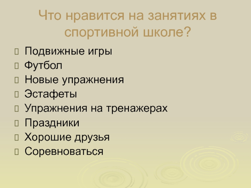 Слайд 13Что нравится на занятиях в спортивной школе?