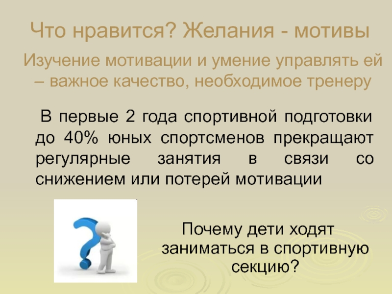 В первые 2 года спортивной подготовки до 40% юных спортсменов прекращают регулярные занятия в связи со снижением или потерей мотивации