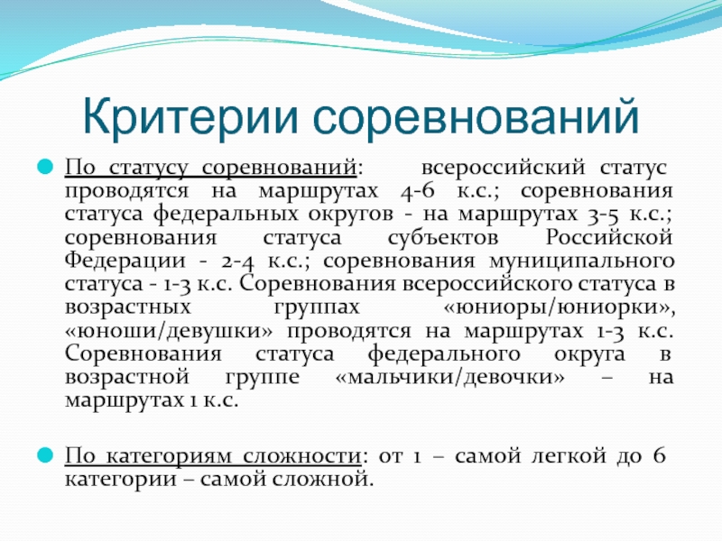 к.с.; соревнования статуса субъектов Российской Федерации - 2-4 к.с.; соревнования муниципального статуса - 1-3 к.с. Соревнования всероссийского статуса в возрастных группах «юниоры/юниорки», «юноши/девушки» проводятся на маршрутах 1-3 к.с. Соревнования статуса федерального округа в возрастной группе «мальчики/девочки» – на маршрутах 1 к.с.