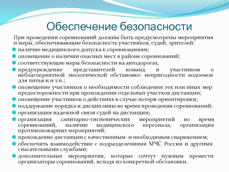 мероприятия и меры, обеспечивающие безопасность участников, судей, зрителей: