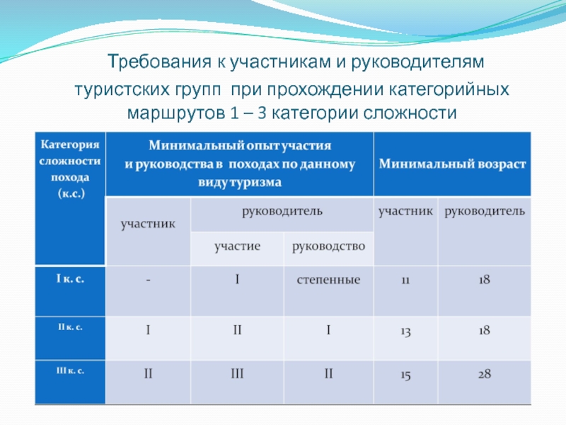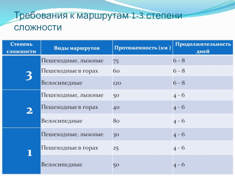 Слайд 9Требования к маршрутам 1-3 степени сложности