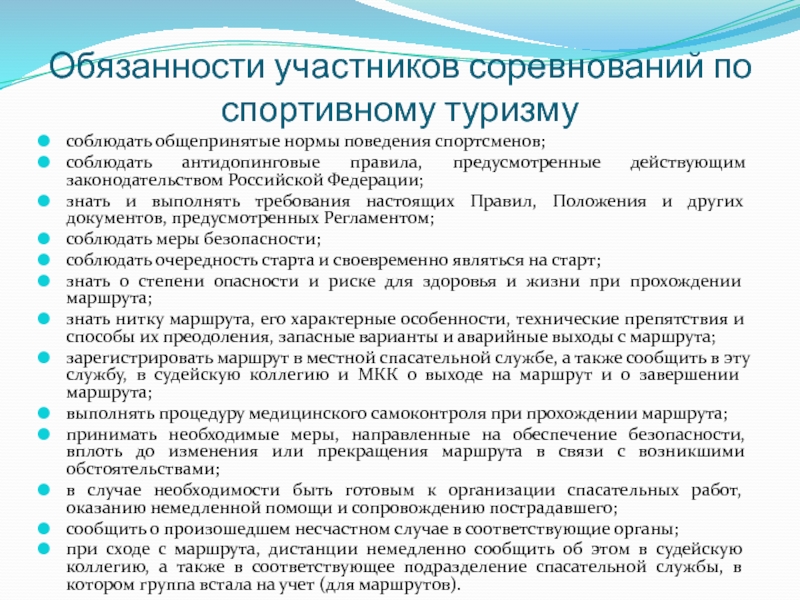 Слайд 18Обязанности участников соревнований по спортивному туризму