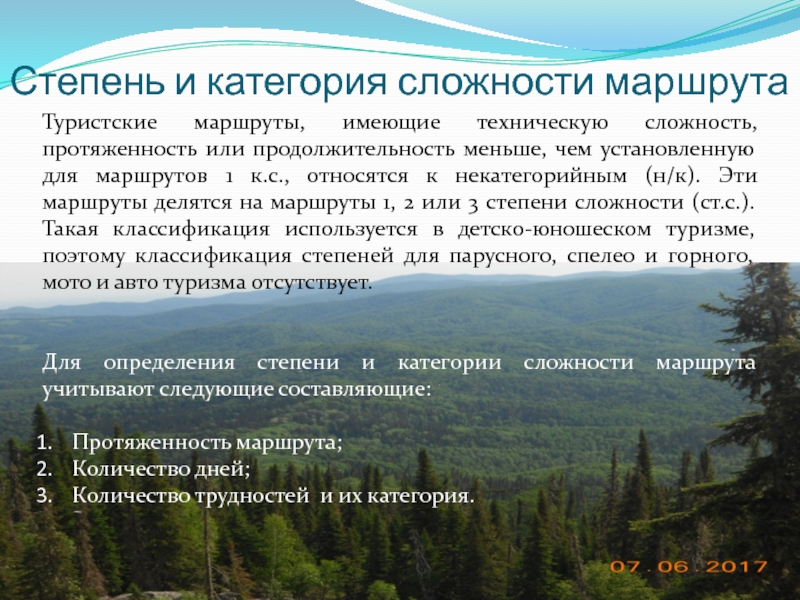 Для определения степени и категории сложности маршрута учитывают следующие составляющие: