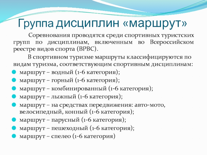 «маршрут», соревнования по которым состоят в прохождении спортивных туристских маршрутов с преодолением категорированных препятствий в природной среде (перевалов, вершин, порогов, каньонов, пещер и пр.);