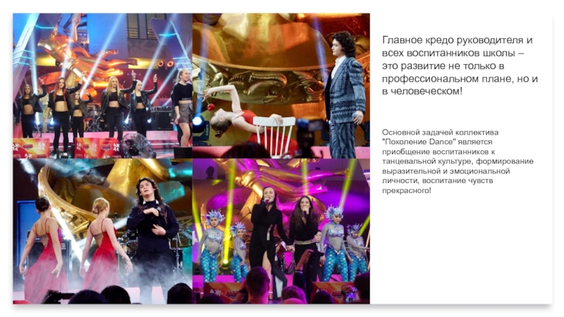 формирование выразительной и эмоциональной личности, воспитание чувств прекрасного.Школа танца «Поколение Dance» для многих членов коллектива – это второй дом! Здесь дети учатся не только профессиональным и спортивным навыкам, но и учатся быть самостоятельными, дисциплинированными, быть заботливыми и уметь дружить!