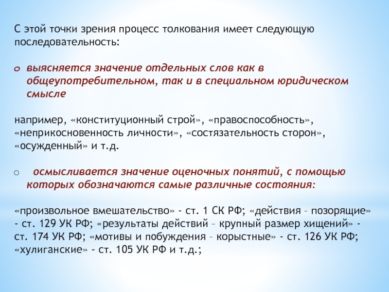 Слайд 4С этой точки зрения процесс толкования имеет следующую последовательность: