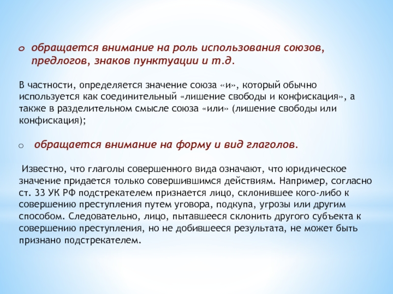 Известно, что глаголы совершенного вида означают, что юридическое значение придается только совершившимся действиям. Например, согласно ст. 33 УК РФ подстрекателем признается лицо, склонившее кого-либо к совершению преступления путем уговора, подкупа, угрозы или другим способом. Следовательно, лицо, пытавшееся склонить другого субъекта к совершению преступления, но не добившееся результата, не может быть признано подстрекателем.