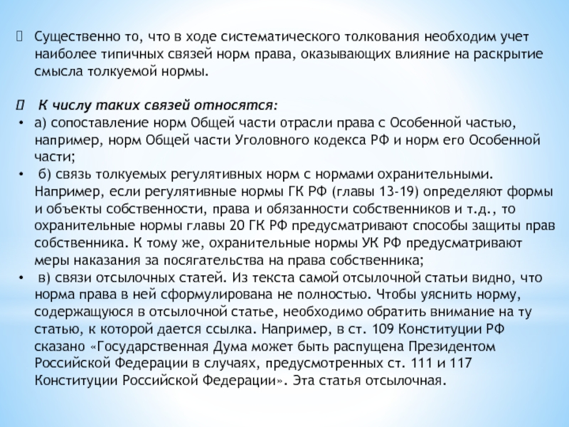 Слайд 10Существенно то, что в ходе систематического толкования необходим учет наиболее