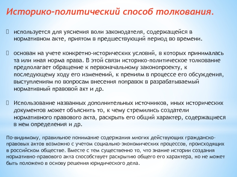 учете конкретно-исторических условий, в которых принималась та или иная норма права. В этой связи историко-политическое толкование предполагает обращение к первоначальному законопроекту, к последующему ходу его изменений, к прениям в процессе его обсуждения, выступлениям по вопросам внесения поправок в разрабатываемый нормативный правовой акт и др.