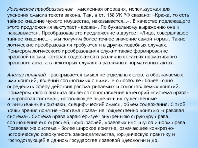 есть тайное хищение чужого имущества, наказывается…». В качестве подлежащего этого предложения выступает «кража». По буквальному выражению она и наказывается. Преобразовав это предложение в другое: «Лицо, совершившее тайное хищение…», мы получим более точное значение самой нормы. Такие логические преобразования требуются и в других подобных случаях. Примером логического преобразования служит также формирование правовой нормы, которая содержится в различных статьях нормативного правового акта, а в некоторых случаях в различных нормативных актах.