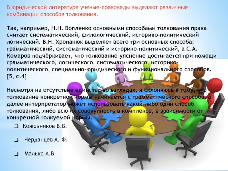 толкования права считает систематический, филологический, историко-политический логический. В.Н. Хропанюк выделяет всего три основных способа: грамматический, систематический и историко-политический, а С.А. Комаров подчёркивает, что толкование-уяснение достигается при помощи грамматического, логического, систематического, историко-политического, специально-юридического и функционального способов. [5, с.4]