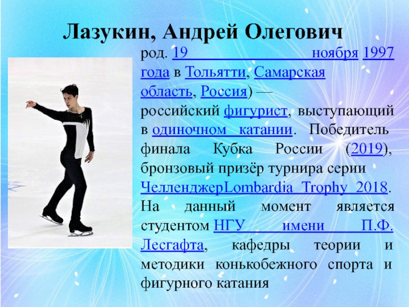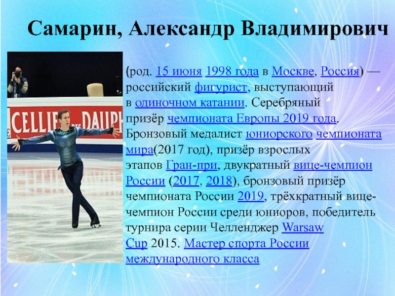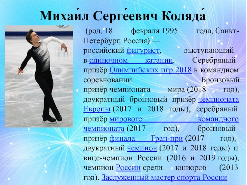 Слайд 11 (род. 18 февраля 1995 года, Санкт-Петербург, Россия) — российский фигурист, выступающий в одиночном катании. Серебряный призёр Олимпийских игр