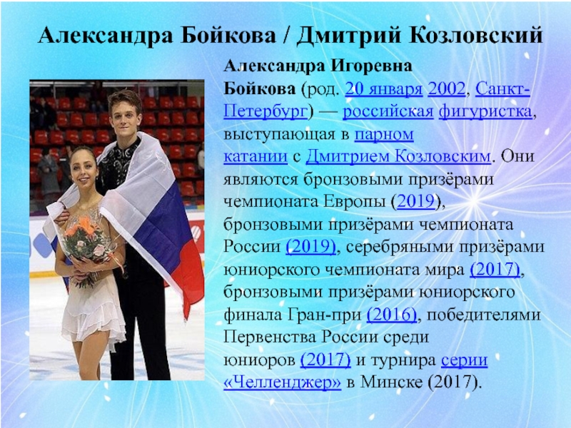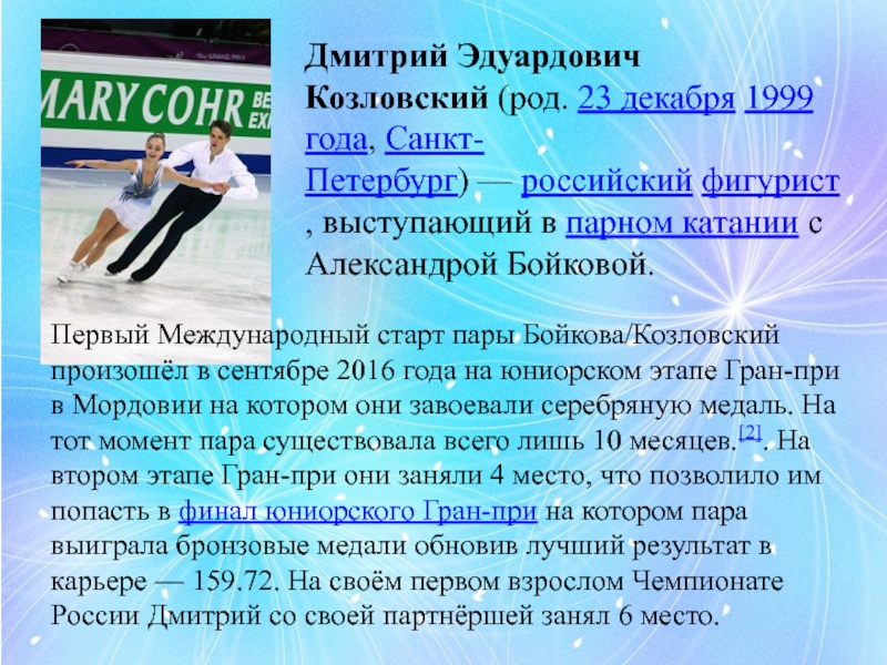 Слайд 22Дмитрий Эдуардович Козловский (род. 23 декабря 1999 года, Санкт-Петербург) — российский фигурист, выступающий в парном катании с Александрой Бойковой.