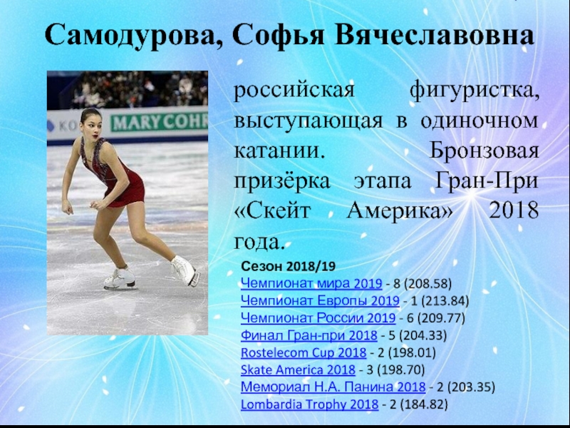 российская фигуристка, выступающая в одиночном катании. Бронзовая призёрка