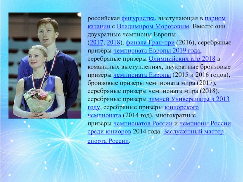 Слайд 17российская фигуристка, выступающая в парном катании с Владимиром Морозовым. Вместе они двукратные чемпионы Европы