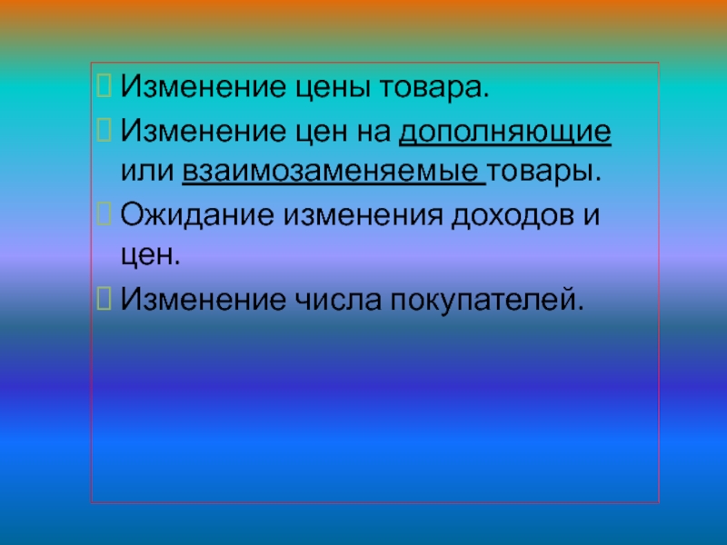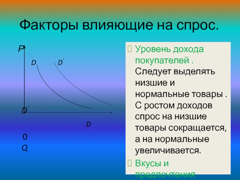 Уровень дохода покупателей . Следует выделять низшие и нормальные товары . С ростом доходов спрос на низшие товары сокращается, а на нормальные увеличивается.