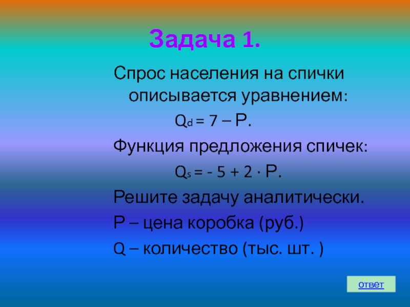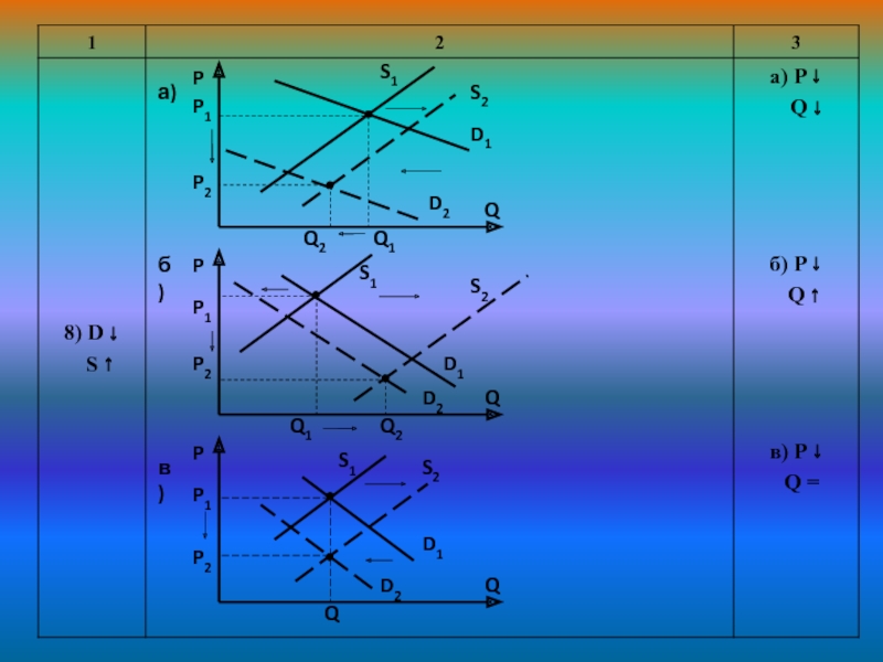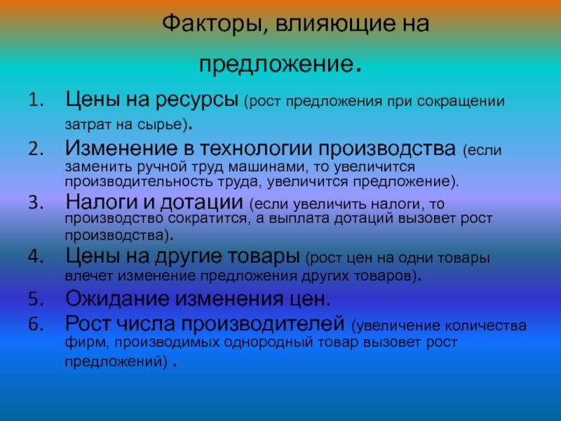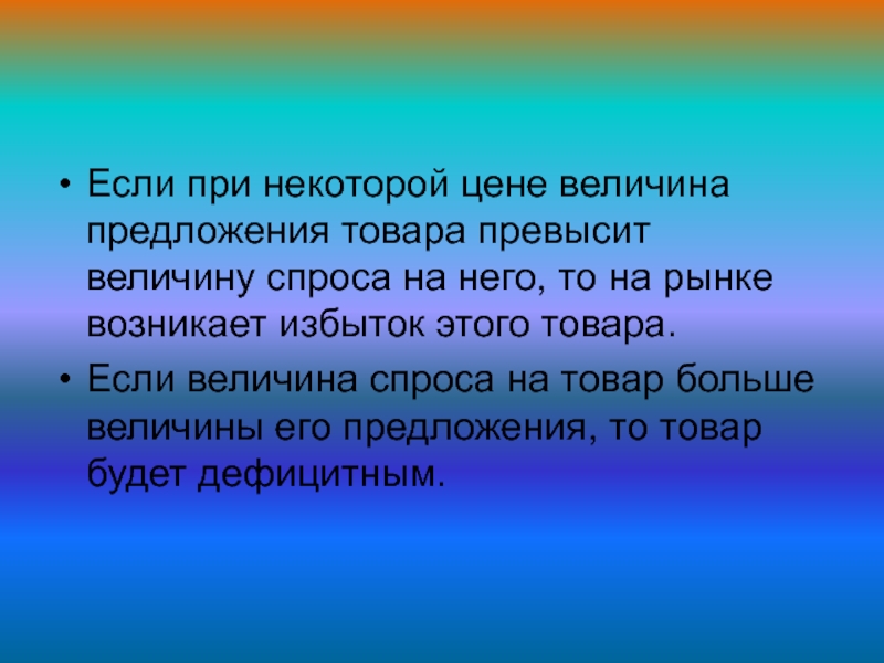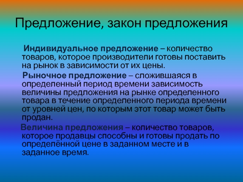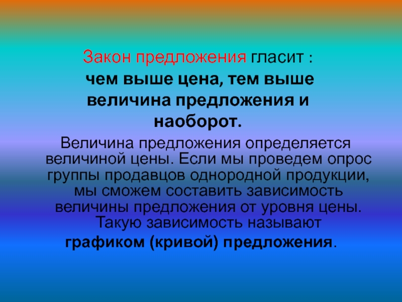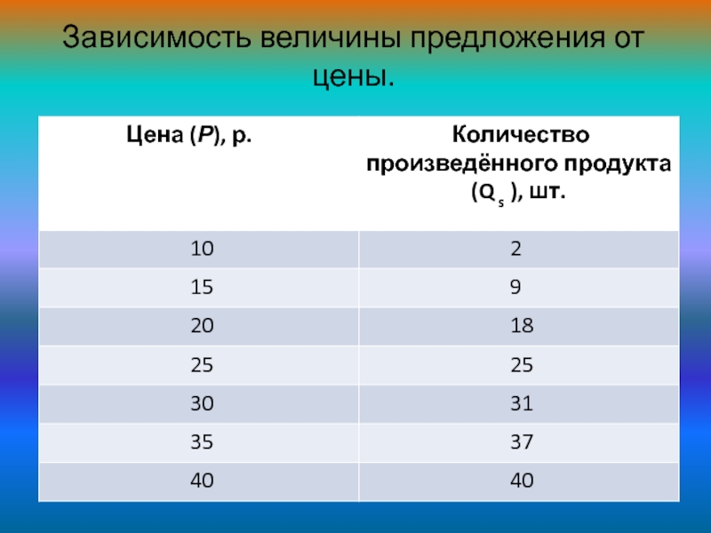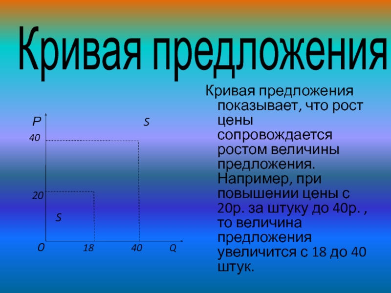 Кривая предложения показывает, что рост цены сопровождается ростом величины предложения. Например, при повышении цены с 20р. за штуку до 40р. , то величина предложения увеличится с 18 до 40 штук.