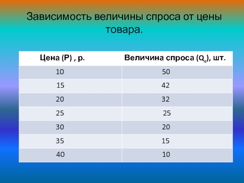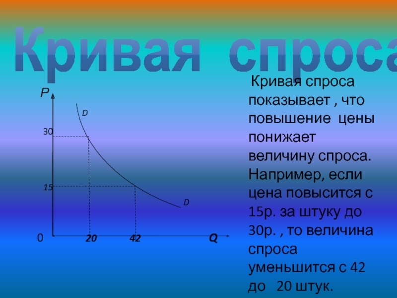 Кривая спроса показывает , что повышение цены понижает величину спроса. Например, если цена повысится с 15р. за штуку до 30р. , то величина спроса уменьшится с 42 до 20 штук.