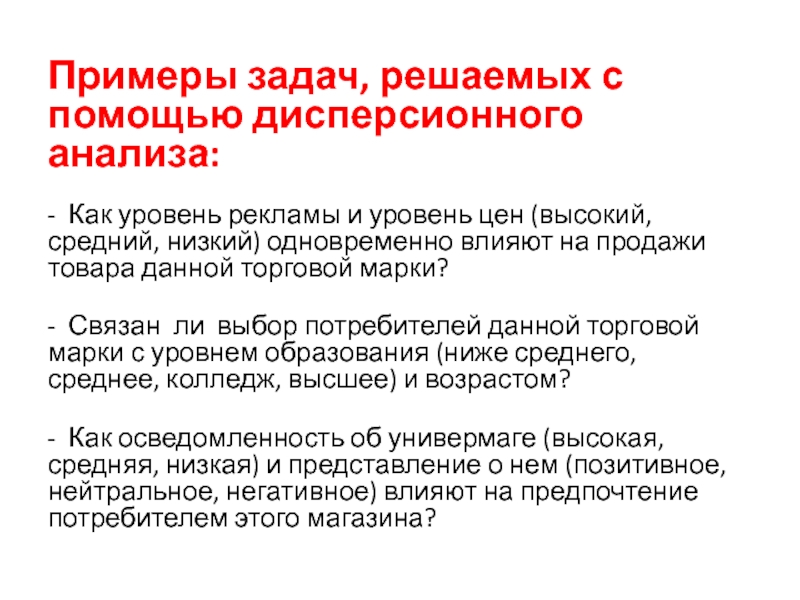 Слайд 8Примеры задач, решаемых с помощью дисперсионного анализа:
