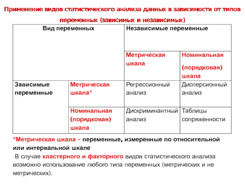 Слайд 6*Метрическая шкала – переменные, измеренные по относительной или интервальной шкале
