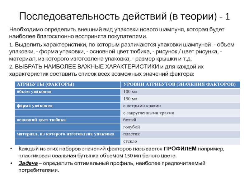 Каждый из этих наборов значений факторов называется ПРОФИЛЕМ например, пластиковая овальная бутылка объемом 150 мл белого цвета.