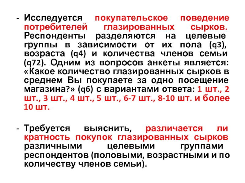 Слайд 15Исследуется покупательское поведение потребителей глазированных сырков. Респонденты разделяются на целевые