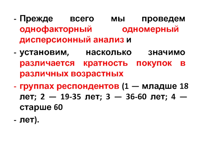 Слайд 16Прежде всего мы проведем однофакторный одномерный дисперсионный анализ и