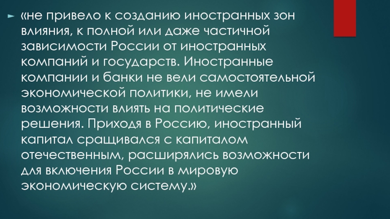 компании и банки не вели самостоятельной экономической политики, не имели возможности влиять на политические решения. Приходя в Россию, иностранный капитал сращивался с капиталом отечественным, расширялись возможности для включения России в мировую экономическую систему.»
