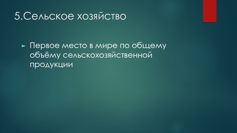 5.	Сельское хозяйствоПервое место в мире по общему объёму сельскохозяйственной продукции