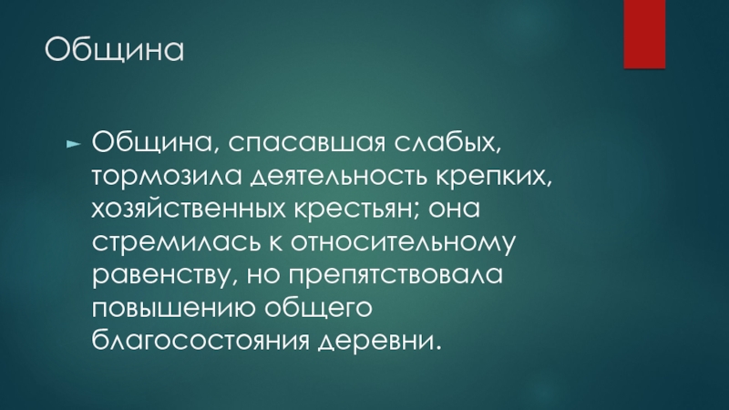 ОбщинаОбщина, спасавшая слабых, тормозила деятельность крепких, хозяйственных крестьян; она стремилась к относительному равенству, но препятствовала повышению общего