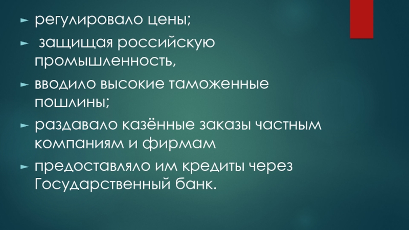 регулировало цены; защищая российскую промышленность, вводило высокие таможенные пошлины; раздавало казённые заказы частным компаниям и фирмампредоставляло им